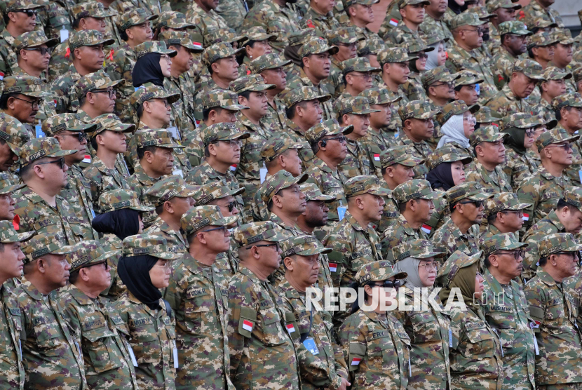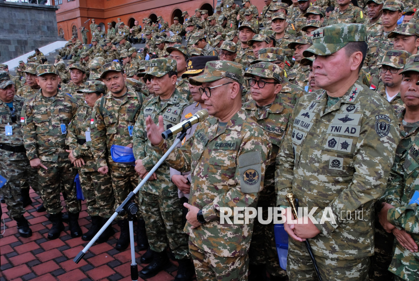 REPUBLIKA.CO.ID, MAGELANG -- Peserta berbaris saat mengikuti upacara penyambutan Retret Ketua DPRD seluruh Indonesia di Kompleks Akademi Militer Magelang, Jawa Tengah, Rabu (15/4/2026).