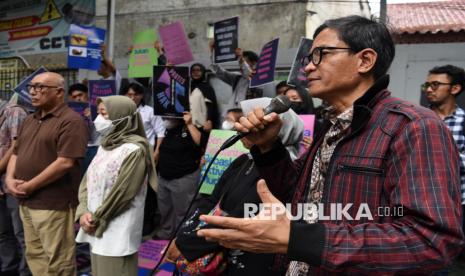 Direktur Eksekutif Amnesty International Indonesia Usman Hamid berorasi dalam aksi dukungan pembebasan para aktivis usai berlangsungnya sidang perdana gugatan praperadilan penetapan tersangka empat aktivis di Pengadilan Negeri Jakarta Selatan, Jakarta, Jumat (17/10/2025). Dalam aksinya mereka menuntut agar pihak kepolisian untuk membebaskan keempat aktivis yakni Delpedro Marhaen, Syahdan Husein, Khariq Anhar, dan Muzaffar Salim yang sebelumnya ditetapkan sebagai tersangka oleh polisi terkait kasus dugaan penghasutan dalam aksi unjuk rasa akhir Agustus 2025 lalu. (FOTO : ANTARA FOTO/Indrianto Eko Suwarso)