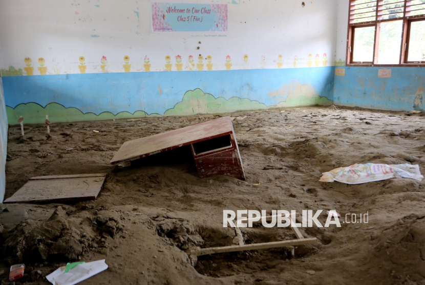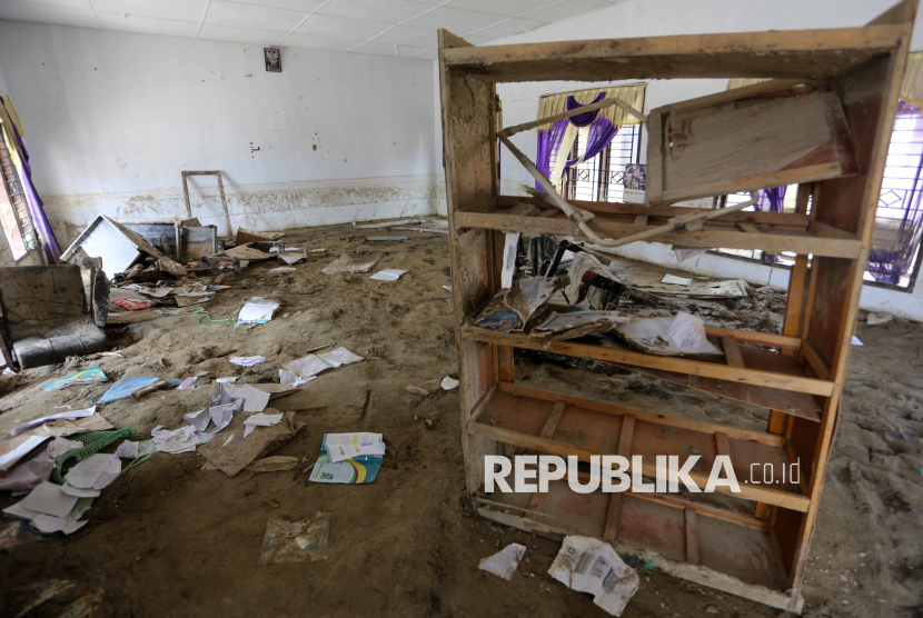 REPUBLIKA.CO.ID, ACEH -- Seorang murid berada di dalam ruang guru yang rusak dan kotor akibat endapan lumpur di SDN 12 Desa Agusen, Blangkejeren, Gayo Lues, Aceh, Rabu (28/1/2026).