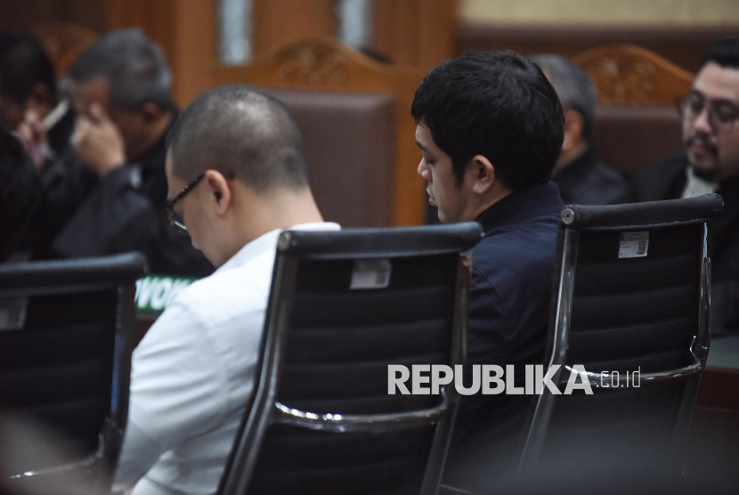 Terdakwa kasus dugaan korupsi tata kelola minyak mentah dan produk kilang pada PT Pertamina Muhamad Kerry Adrianto Riza (kanan) dan Gading Ramadhan Joedo (kiri) mengikuti sidang pembacaan putusan di Pengadilan Tipikor, Jakarta Pusat, Jumat (27/2/2026) dinihari. Majelis hakim memvonis Beneficial owner PT Navigator Khatulistiwa yang juga anak dari Riza Chalid, Muhamad Kerry Adrianto Riza dengan pidana penjara 15 tahun dan denda Rp1 miliar subsider 190 hari kurungan juga menjatuhkan pidana tambahan untuk membayar uang pengganti sejumlah Rp2.905.420.003.854 subsider 5 tahun, serta Komisaris PT Jenggala Maritim Nusantara (JMN) Dimas Werhaspati dan Komisaris PT Pelayaran Mahameru Kencana Abadi (PMKA) Gading Ramadhan Joedo dengan pidana 13 tahun penjara dan denda Rp1 miliar subsider 190 hari kurungan. (FOTO : ANTARA FOTO/Indrianto Eko Suwarso)