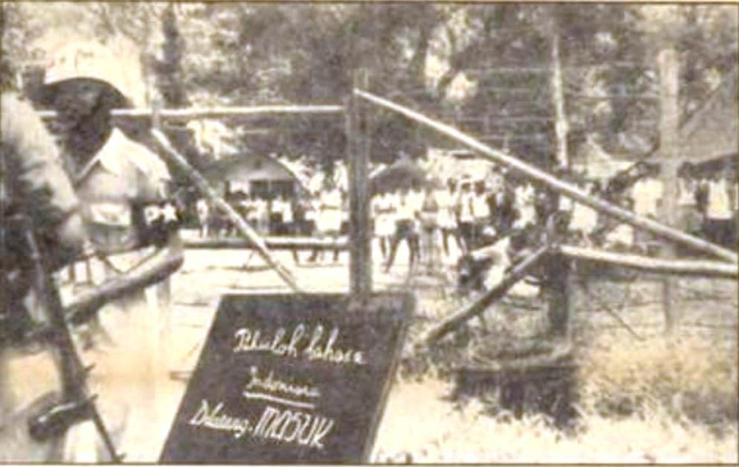 Kamp untuk menahan anggota KNIL yang menjadi anggota Repuplik Maluku Selatan (RMS) di Maluku. Di Maluku, bahasa Belanda menjadi bahasa resmi dan di kamp ini dipasang kewajiban menggunakan bahasa Indonesia. Sumber: majalah de stem van ambon