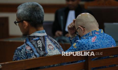 Terdakwa eks Direktur Utama PT Taspen Antonius NS Kosasih (kanan) bersama eks Direktur Utama PT Insight Investment Management Ekiawan Heri Primaryanto (kiri) menjalani sidang pembacaan vonis di Pengadilan Tipikor, Jakarta, Senin (6/11/2025). Majelis Hakim memvonis eks Dirut PT Taspen Antonius NS Kosasih penjara 10 tahun denda Rp500 juta subsider 6 bulan kurungan dan Eks PT IIM Ekiawan Heri Primaryanto 9 tahun penjara, denda Rp500 juta subsider 6 bulan kurungan. (FOTO : Republika/Thoudy Badai)