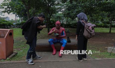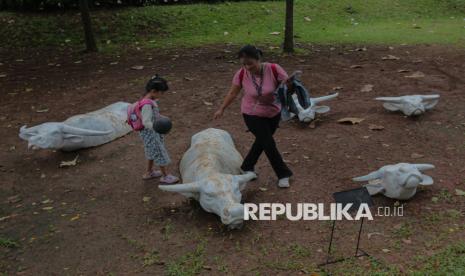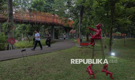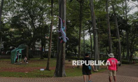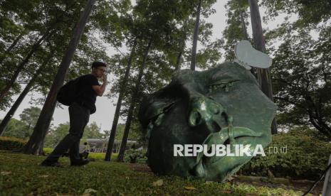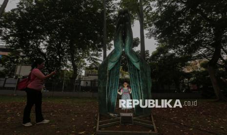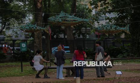 Pengunjung mengamati karya yang dipajang pada Pameran Seni Rupa Jakarta Artmospher 2025 di Tebet Eco Park, Jakarta, Senin (20/10/2025). Pameran tersebut diikuti oleh puluhan seniman dari Jakarta dan Jogjakarta yang menghadirkan produk seni dan budaya di ruang publik dengan harapan menjadi ruang interaksi warga dalam berkesenian. (FOTO : Republika/Thoudy Badai)