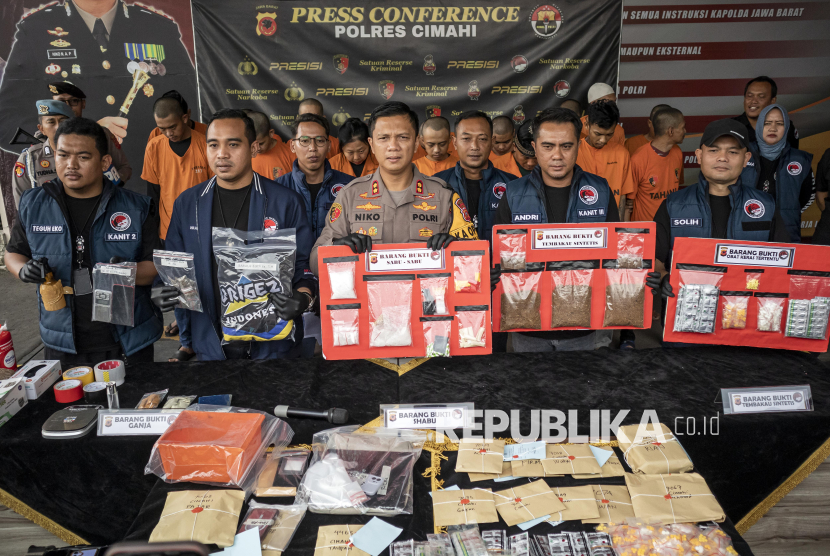 Kapolres Cimahi AKBP Niko N Adi Putra (tengah) menunjukkan barang bukti saat rilis Operasi Anti Narkotika (Antik) Lodaya 2025 di Polres Cimahi, Kota Cimahi, Jawa Barat, Kamis (27/11/2025). Satuan Reserse Narkoba Polres Cimahi berhasil menangkap sebanyak 50 tersangka serta menyita barang bukti narkotika seperti sabu, ganja, ekstasi, tembakau sintetis hingga obat keras yang nilainya mencapai Rp600 juta dari operasi yang dilaksanakan sejak tanggal 6 sampai 26 November lalu. (FOTO : ANTARA FOTO/Abdan Syakura)