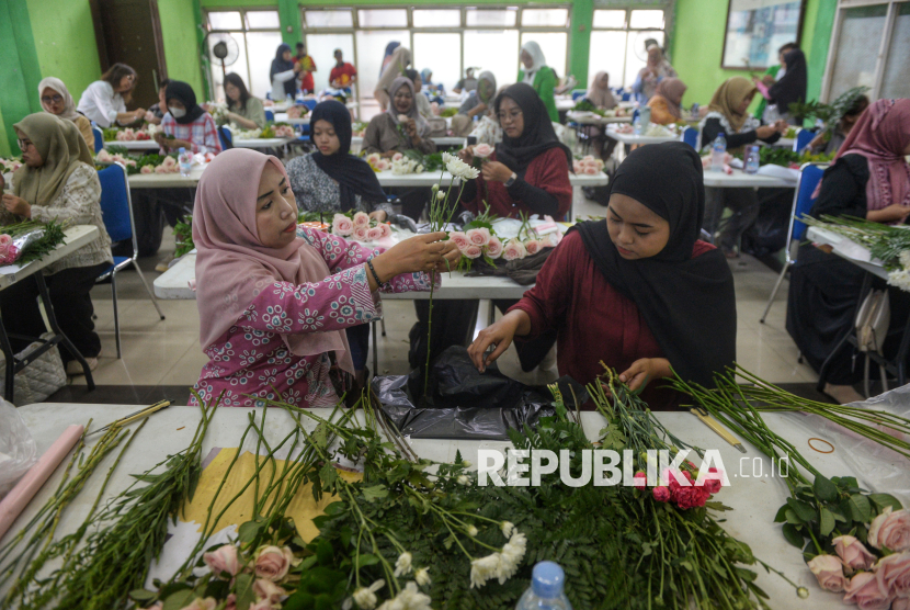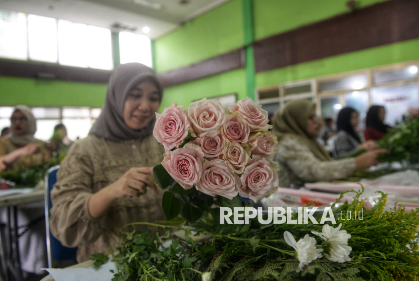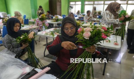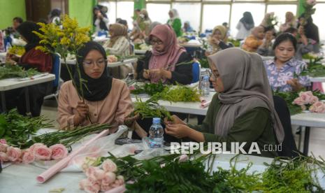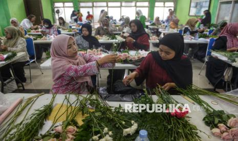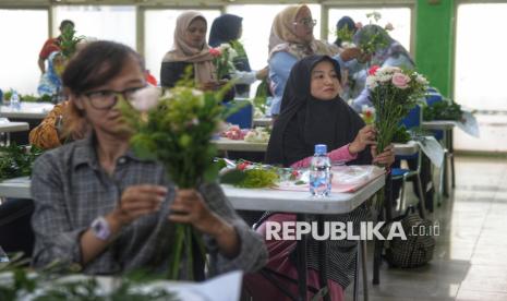 REPUBLIKA.CO.ID, JAKARTA -- Sejumlah warga mengikuti bimbingan teknis (bimtek) merangkai hand bouquet di Pasar Rawa Belong, Jakarta, Rabu (22/10/2025).