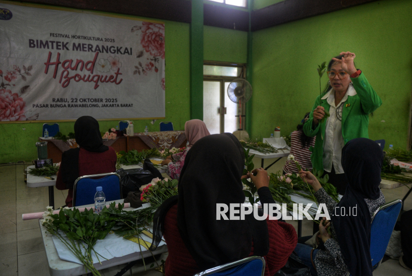 Instruktur membimbing warga yang mengikuti bimbingan teknis (bimtek) merangkai hand bouquet di Pasar Rawa Belong, Jakarta, Rabu (22/10/2025). Kegiatan yang diselenggarakan oleh Dinas Ketahanan Pangan, Kelautan, dan Pertanian (DKPKP) Provinsi DKI Jakarta bekerja sama dengan Ikatan Perangkai Bunga Indonesia (IPBI) ini diikuti oleh 40 peserta dari lima wilayah di Jakarta. Kegiatan tersebut bertujuan memberdayakan warga agar memiliki keterampilan kreatif dan produktif melalui pembuatan hand bouquet, sehingga dapat meningkatkan kemandirian ekonomi serta membuka peluang usaha baru. Selain itu, kegiatan ini juga merupakan rangkaian dari Festival Hortikultura 2025.Salah satu peserta, Icha (30), mengungkapkan bahwa pelatihan ini sangat bermanfaat karena dapat menambah keterampilannya. (FOTO : Republika/Prayogi)