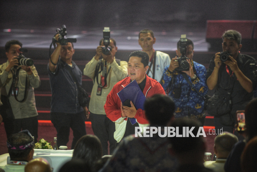 Menteri Pemuda dan Olahraga Erick Thohir saat menghadiri Puncak Acara Nasional Peringatan Hari Sumpah Pemuda (HSP) ke-97 Tahun 2025 di Hall Basket Gelora Bung Karno (GBK), Senayan, Jakarta, Selasa (28/10/2025). Dengan mengangkat tema Pemuda Pemudi Bergerak, Indonesia Bersatu. Peringatan HSP tahun ini menjadi momentum untuk memperkuat semangat kolaborasi lintas sektor dalam membangun karakter pemuda yang patriotik, gigih, dan berempati. Kegiatan ini juga menjadi ajang apresiasi dan refleksi atas peran generasi muda dalam memperkokoh persatuan serta mendorong kemajuan bangsa Indonesia. (FOTO : Republika/Prayogi)
