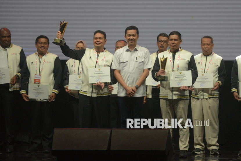 Wakil Menteri Pemuda dan Olahraga Taufik Hidayat berfoto bersama para penerimaan penghargaan Wirasena 2025 pada Puncak Acara Nasional Peringatan Hari Sumpah Pemuda (HSP) ke-97 Tahun 2025 di Hall Basket Gelora Bung Karno (GBK), Senayan, Jakarta, Selasa (28/10/2025). Dengan mengangkat tema Pemuda Pemudi Bergerak, Indonesia Bersatu. Peringatan HSP tahun ini menjadi momentum untuk memperkuat semangat kolaborasi lintas sektor dalam membangun karakter pemuda yang patriotik, gigih, dan berempati. Kegiatan ini juga menjadi ajang apresiasi dan refleksi atas peran generasi muda dalam memperkokoh persatuan serta mendorong kemajuan bangsa Indonesia. (FOTO : Republika/Prayogi)