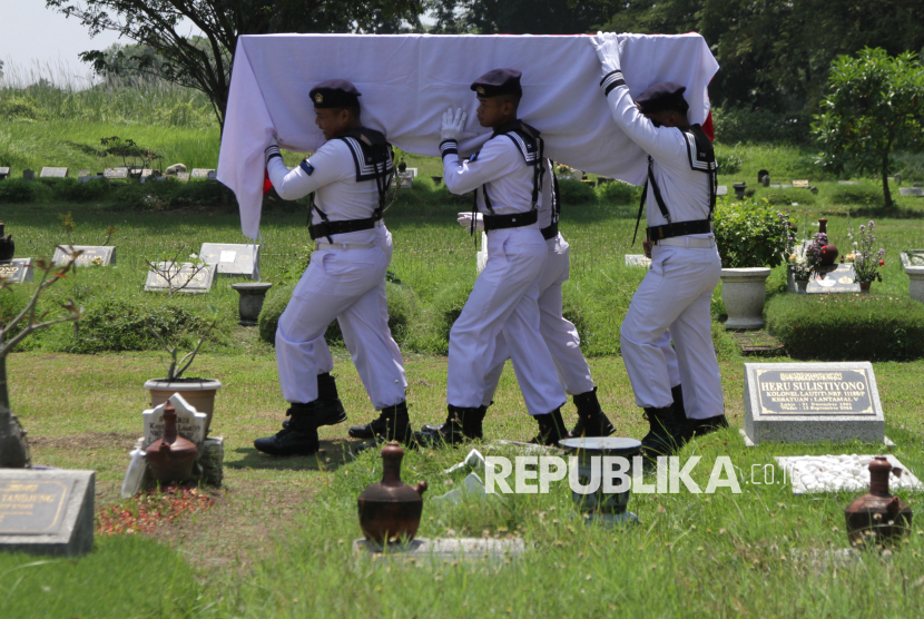 Prajurit TNI membawa peti jenazah pilot helikopter Airbus H130 registrasi PK-CFX Capt Marinda Wibowo saat prosesi pemakaman di Taman Makam Bahagia TNI AL Desa Gisik Cemandi, Sedati, Sidoarjo, Jawa Timur, Sabtu (18/4/2026). Capt Marinda Wibowo merupakan salah satu dari delapan korban meninggal dunia kecelakaan helikopter di Bukit Puntak, Desa Tapang Tingang, Kecamatan Nanga Taman, Kabupaten Sekadau, Kalimantan Barat pada Kamis (16/4). (FOTO : ANTARA FOTO/Umarul Faruq)