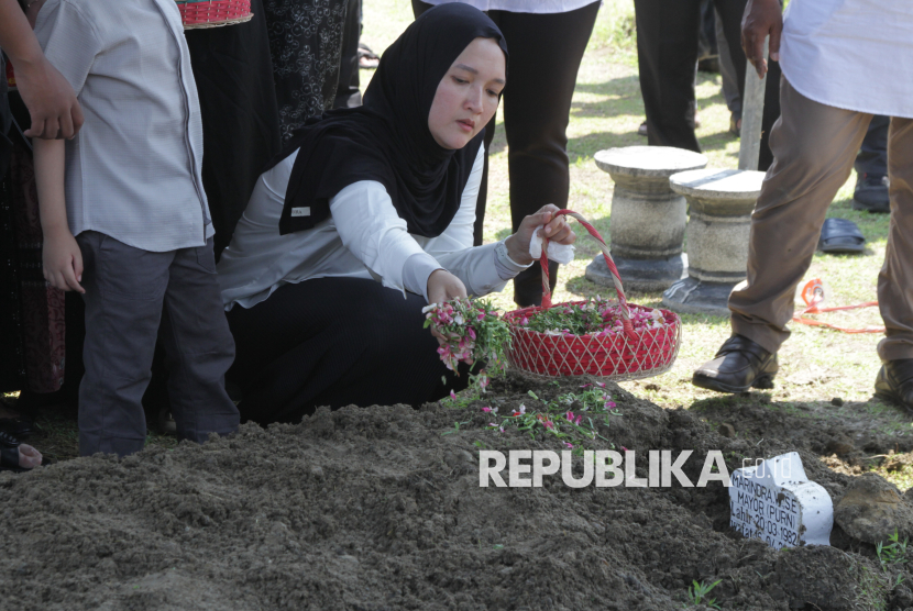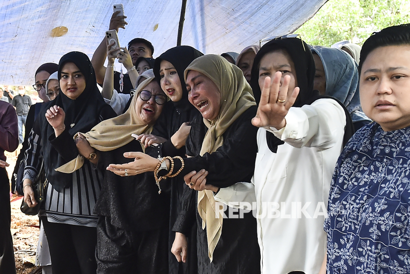 REPUBLIKA.CO.ID, CIMAHI -- Keluarga dan kerabat menangis saat prosesi pemakaman jenazah teknisi helikopter Airbus H130 registrasi PK-CFX, Harun Arasyid di Tempat Pemakaman Umum (TPU) Citereup, Kota Cimahi, Jawa Barat, Sabtu (18/4/2026).