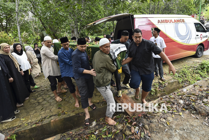 Keluarga dan kerabat mengangkat peti jenazah korban kecelakaan helikopter, Fauzie Orbanta saat dimakamkan di TPU Pusara Agung, Jambi, Sabtu (18/4/2026). Fauzie Orbanta merupakan salah satu dari delapan korban meninggal akibat kecelakaan helikopter Airbus H130 PK-CFX di wilayah hutan Kabupaten Sekadau, Kalimantan Barat. (FOTO : ANTARA FOTO/Wahdi Septiawan)