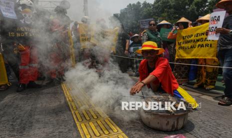 Warga Pulau Pari bersama aktivis lingkungan membakar ikan saat menggelar aksi damai dan kreatif di depan Gedung Kementerian Kelautan dan Perikanan (KKP), Jakarta, Rabu (8/10/2025). Dalam aksi tersebut, mereka mendesak pemerintah mencabut izin Persetujuan Kesesuaian Kegiatan Pemanfaatan Ruang Laut (PKKPRL) reklamasi proyek swasta yang dinilai memperparah kerusakan ekosistem Pulau Pari di tengah gempuran krisis iklim. Pulau Pari, yang merupakan salah satu destinasi wisata populer di Kepulauan Seribu, kini terancam hilang akibat kombinasi dampak krisis iklim dan proyek reklamasi oleh perusahaan swasta. Pemberian izin yang dianggap serampangan oleh KKP membuat warga Pulau Pari menanggung beban berlipat yang mengancam keberlangsungan hidup serta keberadaan pulau tersebut. Para warga dan aktivis juga membawa replika kapal Thousand Sunny yang terinspirasi dari animasi populer One Piece. Mereka turut membentangkan spanduk besar bertuliskan Lindungi Pulau Kecil, Selamatkan Pulau Pari. (FOTO : Republika/Prayogi)