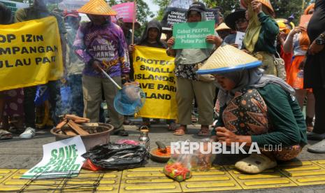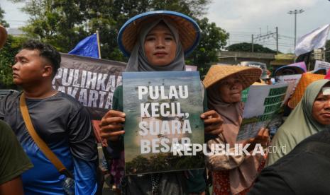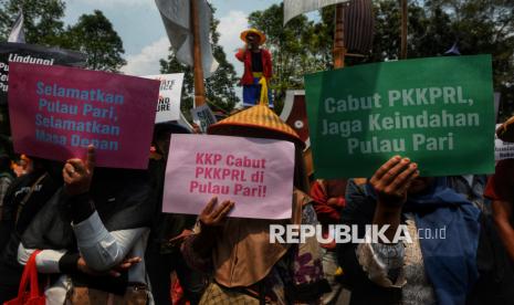 REPUBLIKA.CO.ID, JAKARTA -- Warga Pulau Pari bersama aktivis lingkungan menggelar aksi damai dan kreatif di depan Gedung Kementerian Kelautan dan Perikanan (KKP), Jakarta, Rabu (8/10/2025).