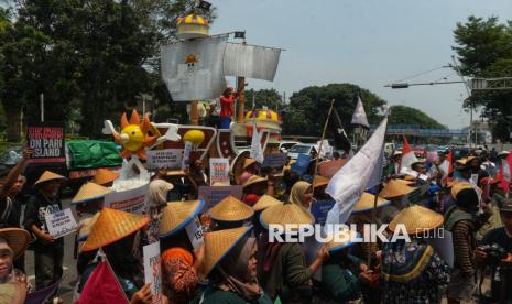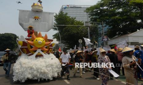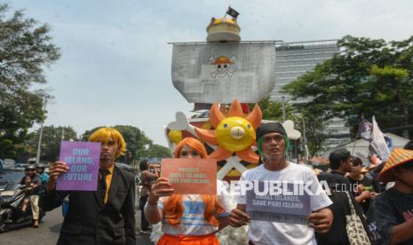 Warga Pulau Pari bersama aktivis lingkungan menggelar aksi damai dan kreatif di depan Gedung Kementerian Kelautan dan Perikanan (KKP), Jakarta, Rabu (8/10/2025). Dalam aksi tersebut, mereka mendesak pemerintah mencabut izin Persetujuan Kesesuaian Kegiatan Pemanfaatan Ruang Laut (PKKPRL) reklamasi proyek swasta yang dinilai memperparah kerusakan ekosistem Pulau Pari di tengah gempuran krisis iklim. Pulau Pari, yang merupakan salah satu destinasi wisata populer di Kepulauan Seribu, kini terancam hilang akibat kombinasi dampak krisis iklim dan proyek reklamasi oleh perusahaan swasta. Pemberian izin yang dianggap serampangan oleh KKP membuat warga Pulau Pari menanggung beban berlipat yang mengancam keberlangsungan hidup serta keberadaan pulau tersebut. Para warga dan aktivis juga membawa replika kapal Thousand Sunny yang terinspirasi dari animasi populer One Piece. Mereka turut membentangkan spanduk besar bertuliskan Lindungi Pulau Kecil, Selamatkan Pulau Pari. (FOTO : Republika/Prayogi)