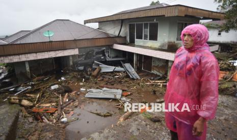 Warga berada di depan rumah yang terdampak longsor di Toboh Tangah, Nagari Malalak Timur, Agam, Sumatera Barat, Kamis (27/11/2025). Longsor yang terjadi karena tingginya intensitas hujan di daerah perbukan pada Rabu (26/11/2025) tersebut mengakibatkan puluhan rumah rusak dan sedikitnya tujuh korban meninggal dunia, belasan lainnya hilang, dan akses menuju lokasi putus total. (FOTO : ANTARA FOTO/Iggoy el Fitra)
