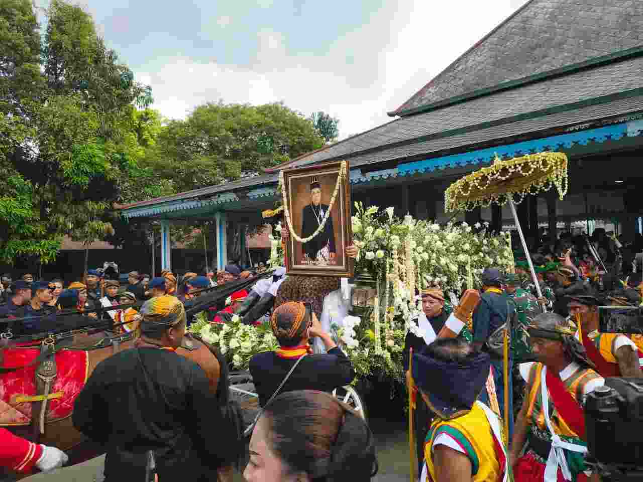 Iringan abdi dalem membawa peti jenazah melintasi Pendapa Agung kemudian masuk ke Sasana Sewaka. Dari situ, jenazah dilepas dengan cara dinaikkan oleh abdi dalem dibantu sejumlah prajurit TNI beseragam lengkap ke kereta kuda yang sudah dihias berbagai macam kembang.