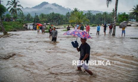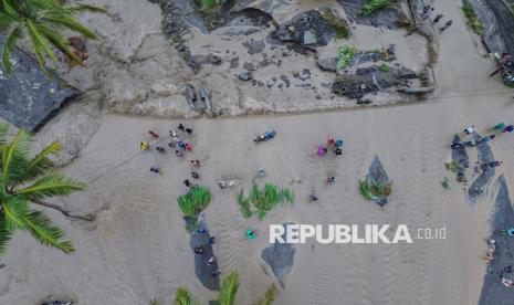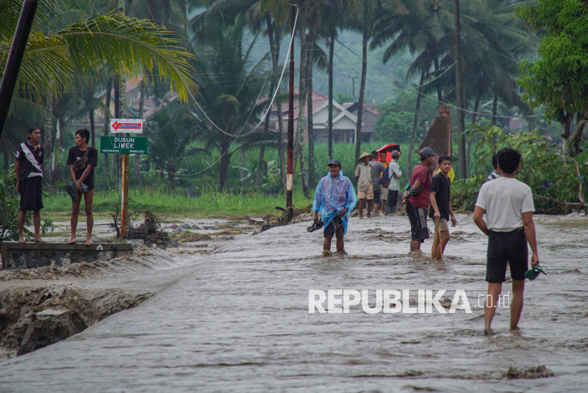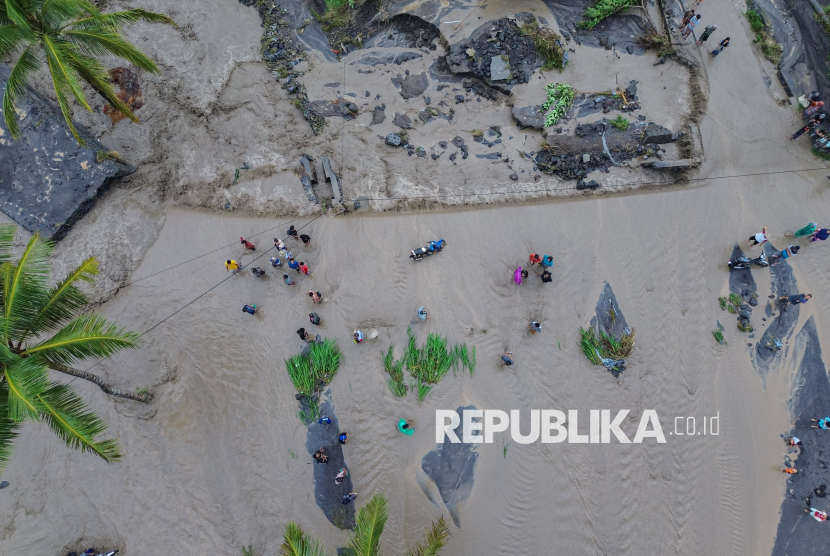 REPUBLIKA.CO.ID, LUMAJANG -- Warga melintasi lahar hujan Gunung Semeru yang meluap dari Sungai Regoyo di Desa Gondoruso, Kecamatan Pasirian, Lumajang, Jawa Timur, Rabu (5/11/2025).