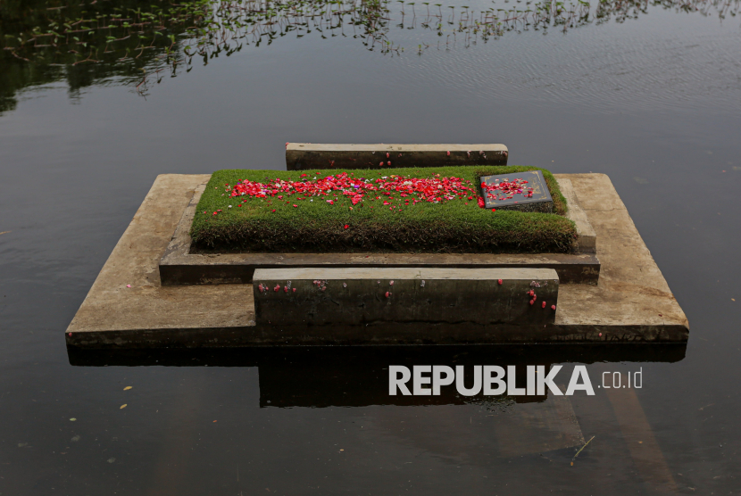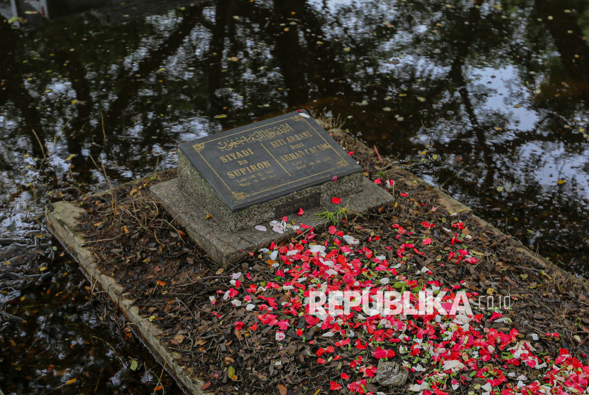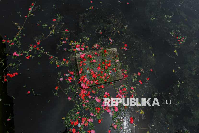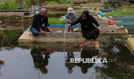 Bunga-bunga ditaburkan di atas makam yang terendam banjir di TPU Semper, Jakarta Utara, Ahad (15/2/2026). Tradisi ziarah dilakukan oleh umat muslim menjelang bulan suci Ramadhan untuk mendoakan dan membersihkan makam keluarganya. Menurut salah satu warga, kuburan keluarganya terendam sejak tahun 2023 lalu hingga saat ini. Sekitar ratusan makam di kawasan tersebut terendam akibat intensitas hujan yang tinggi, drainase yang buruk serta permukaan tanah yang lebih rendah dari jalan raya. (FOTO : Republika/Thoudy Badai)