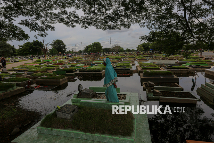 Warga berziarah di makam keluargannya yang terendam banjir di TPU Semper, Jakarta Utara, Ahad (15/2/2026). Tradisi ziarah dilakukan oleh umat muslim menjelang bulan suci Ramadhan untuk mendoakan dan membersihkan makam keluarganya. Menurut salah satu warga, kuburan keluarganya terendam sejak tahun 2023 lalu hingga saat ini. Sekitar ratusan makam di kawasan tersebut terendam akibat intensitas hujan yang tinggi, drainase yang buruk serta permukaan tanah yang lebih rendah dari jalan raya. (FOTO : Republika/Thoudy Badai)