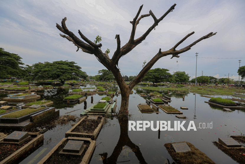 Lanskap pemakaman yang terendam banjir di TPU Semper, Jakarta Utara, Ahad (15/2/2026). Tradisi ziarah dilakukan oleh umat muslim menjelang bulan suci Ramadhan untuk mendoakan dan membersihkan makam keluarganya. Menurut salah satu warga, kuburan keluarganya terendam sejak tahun 2023 lalu hingga saat ini. Sekitar ratusan makam di kawasan tersebut terendam akibat intensitas hujan yang tinggi, drainase yang buruk serta permukaan tanah yang lebih rendah dari jalan raya. (FOTO : Republika/Thoudy Badai)