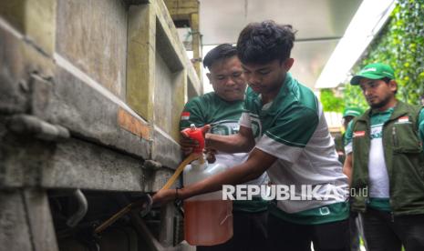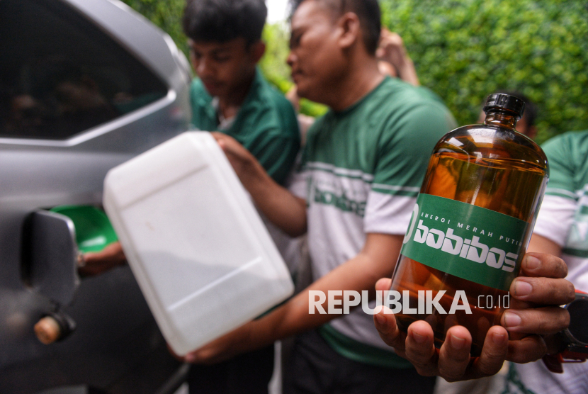 Tim pendukung Bobibos menuangkan bahan bakar Bobibos Energi Merah Putih ke tangki kendaraan seusai konferensi pers terkait Bobibos Energi Merah Putih di Bumi Sultan Jonggol, Bogor, Jawa Barat, Selasa (11/11/2025). Bahan bakar alternatif bernama Bobibos, yang diklaim memiliki kadar oktana (RON) tinggi dan emisi rendah, diharapkan menjadi solusi potensial untuk menekan ketergantungan Indonesia terhadap energi impor. Inovasi energi terbarukan ramah lingkungan ini lahir dari kreativitas anak bangsa. Bobibos memiliki dua jenis bahan bakar, yakni bensin dan solar, yang memanfaatkan jerami sebagai bahan baku. (FOTO : Republika/Prayogi)