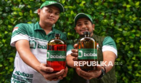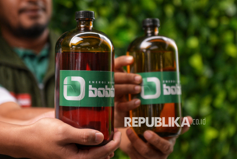 Tim pendukung Bobibos menunjukan bahan bakar Bobibos Energi Merah Putih seusai konferensi pers terkait Bobibos Energi Merah Putih di Bumi Sultan Jonggol, Bogor, Jawa Barat, Selasa (11/11/2025). Bahan bakar alternatif bernama Bobibos, yang diklaim memiliki kadar oktana (RON) tinggi dan emisi rendah, diharapkan menjadi solusi potensial untuk menekan ketergantungan Indonesia terhadap energi impor. Inovasi energi terbarukan ramah lingkungan ini lahir dari kreativitas anak bangsa. Bobibos memiliki dua jenis bahan bakar, yakni bensin dan solar, yang memanfaatkan jerami sebagai bahan baku. (FOTO : Republika/Prayogi)