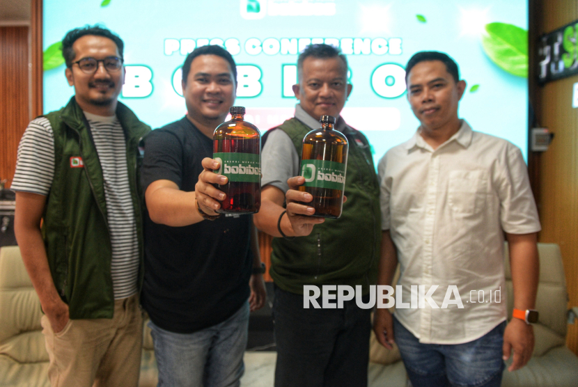 Direktur Pemasaran Bobibos Randy Firdaus, Founder Bobibos M Ikhlas Thamrin, Pembina Bobibos Mulyadi dan Peneliti Bobibos Doni (dari kiri) menunjukkan Bobibos usai konferensi pers terkait Bobibos Energi Merah Putih di Bumi Sultan Jonggol, Bogor, Jawa Barat, Selasa (11/11/2025). Bahan bakar alternatif bernama Bobibos, yang diklaim memiliki kadar oktana (RON) tinggi dan emisi rendah, diharapkan menjadi solusi potensial untuk menekan ketergantungan Indonesia terhadap energi impor. Inovasi energi terbarukan ramah lingkungan ini lahir dari kreativitas anak bangsa. Bobibos memiliki dua jenis bahan bakar, yakni bensin dan solar, yang memanfaatkan jerami sebagai bahan baku. (FOTO : Republika/Prayogi)