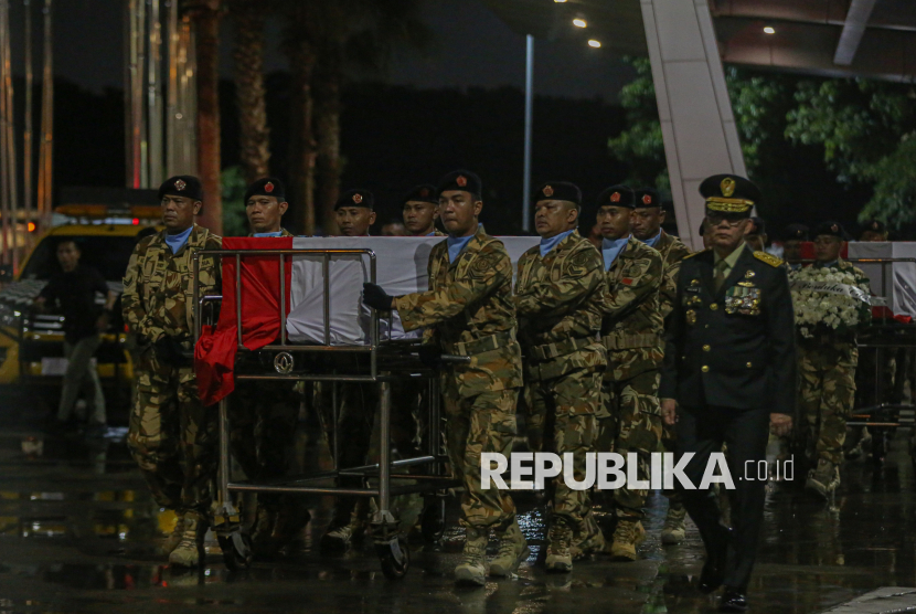 Sejumlah prajurit TNI membawa peti jenazah personel penjaga perdamaian yang tergabung dalam United Nations Interim Force in Lebanon (UNIFIL) seusai disemayamkan di Terminal 3 Bandara Soekarno-Hatta, Tangerang, Banten, Sabtu (4/4/2026). Jenazah Mayor Inf (Anm) Zulmi Aditya Iskandar, Serka (Anm) M. Nur Ichwan, dan Kopda (Anm) Farizal Rhomadon disambut melalui upacara militer dan persemayaman sebagai bentuk penghormatan terakhir sebelum diterbangkan ke daerah asal masing-masing. (FOTO : Republika/Thoudy Badai)