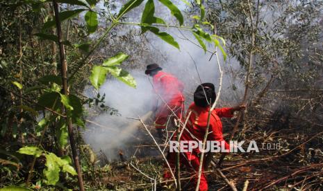 REPUBLIKA.CO.ID, RIAU -- Seorang anggota Manggala Agni melakukan proses pendinginan lahan gambut pascakebakaran di Kelurahan Mundam Medang Kampai, Dumai, Riau, Selasa (3/2/2026).