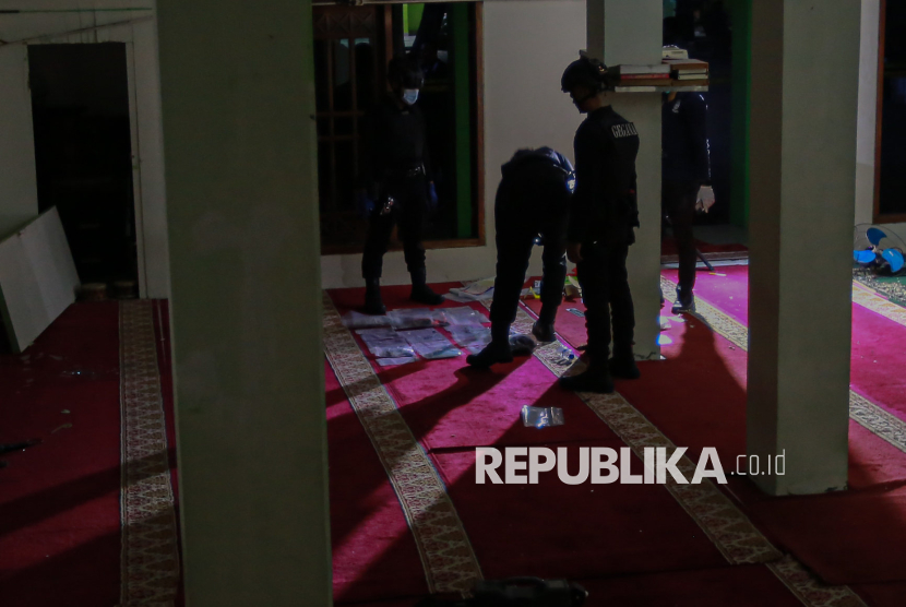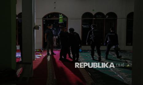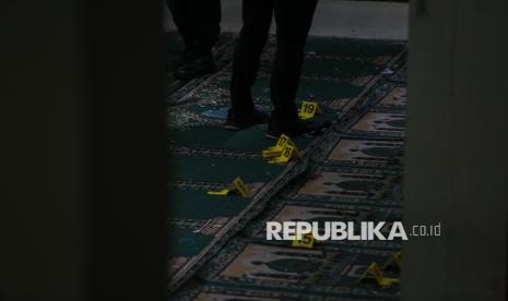 Tim Laboratorium Forensik (Labfor) Bareskrim Polri melakukan olah TKP di lokasi ledakan di SMAN 72 Jakarta, Kelapa Gading, Jakarta, Jumat (7/11/2025). Peristiwa ledakan tersebut terjadi sebanyak dua kali pada sekitar pukul 12.15 WIB di area musala sekolah saat sejumlah siswa dan guru sedang melaksanakan ibadah shalat Jumat. (FOTO : Republika/Thoudy Badai)