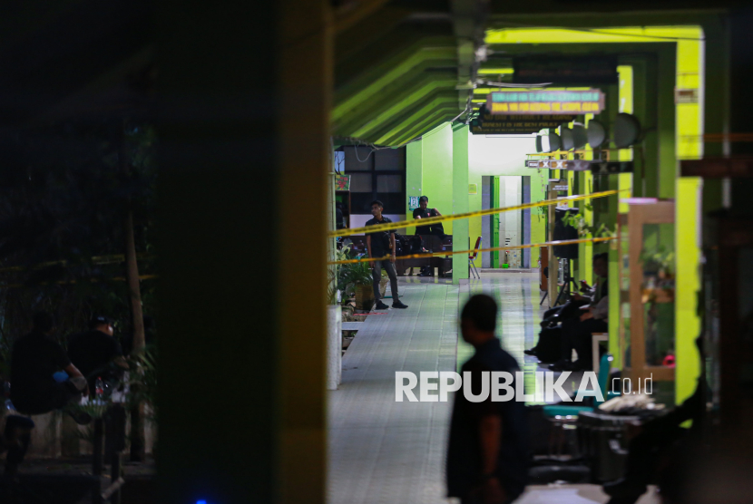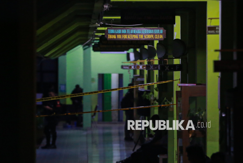 Suasana di area lokasi ledakan di SMAN 72 Jakarta, Kelapa Gading, Jakarta, Jumat (7/11/2025). Kapolda Metro Jaya Irjen Pol Asep Edi Suheri mengungkapkan hingga saat ini pukul 19.00 WIB proses olah TKP masih berlangsung dan pihak kepolisian masih melakukan pendalaman terkait insiden ledakan tersebut. (FOTO : Republika/Thoudy Badai)
