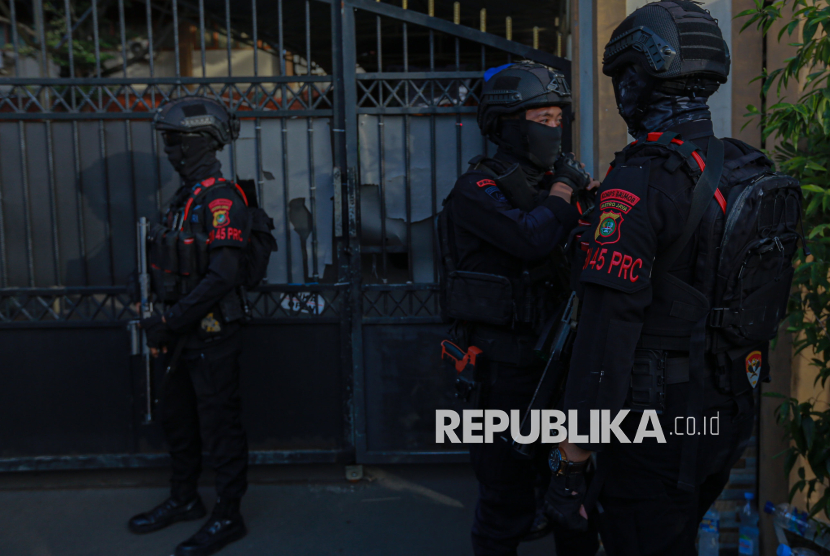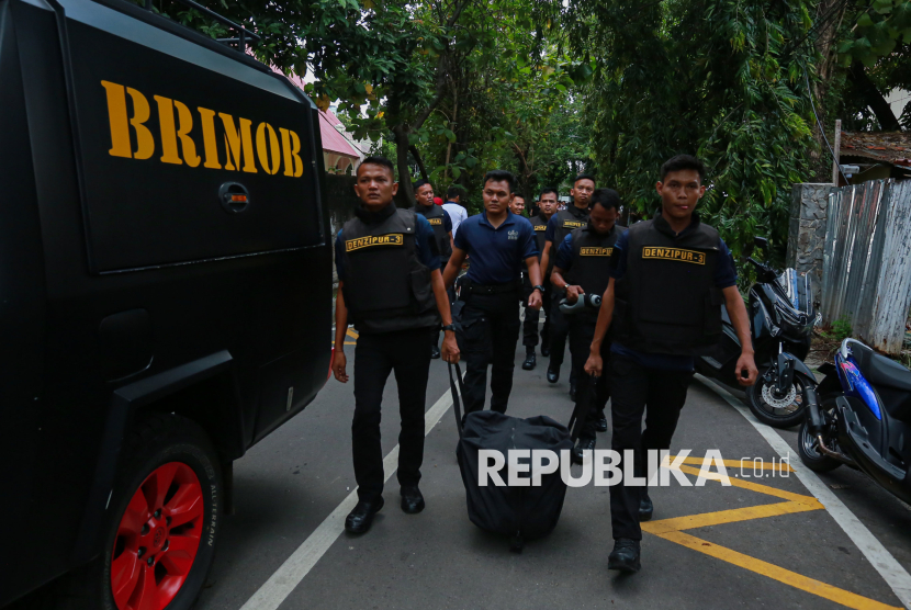 Personel Brimob berjaga di lokasi ledakan di SMAN 72 Jakarta, Kelapa Gading, Jakarta, Jumat (7/11/2025). (FOTO : Republika/Thoudy Badai)