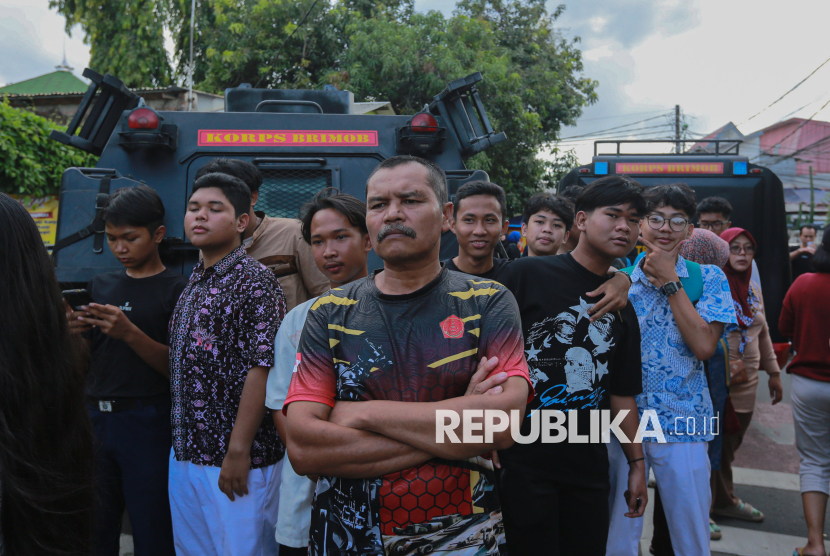 Warga beraktivitas di area lokasi ledakan di SMAN 72 Jakarta, Kelapa Gading, Jakarta, Jumat (7/11/2025). Kapolda Metro Jaya Irjen Pol Asep Edi Suheri mengungkapkan hingga saat ini pukul 19.00 WIB proses olah TKP masih berlangsung dan pihak kepolisian masih melakukan pendalaman terkait insiden ledakan tersebut. (FOTO : Republika/Thoudy Badai)
