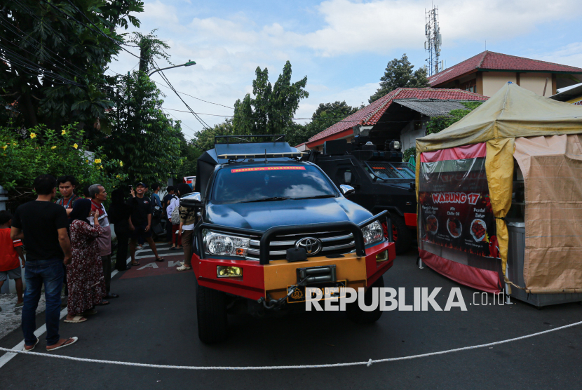 Kendaraan Brimob berada di lokasi ledakan di SMAN 72 Jakarta, Kelapa Gading, Jakarta, Jumat (7/11/2025). Menurut keterangan Gubernur DKI Jakarta, Pramono Anung, jumlah korban luka akibat insiden tersebut hingga saat ini sebanyak 55 orang. (FOTO : Republika/Thoudy Badai)