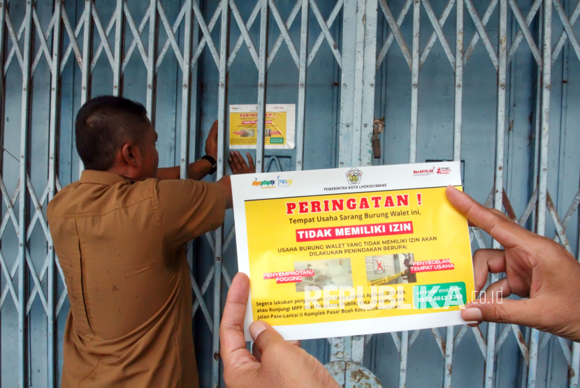 Petugas gabungan menempel stiker peringatan tempat usaha sarang burung walet yang tidak berizin di pusat Kota Lhokseumawe, Aceh, Selasa (7/4/2026). Dinas Penanaman Modal Pelayanan Terpadu Satu Pintu dan Tenaga Kerja, Badan Pengelolaan Keuangan Daerah Bidang Pendapatan Asli Daerah dan Satpol PP setempat menertibkan sebanyak 118 usaha walet yang tidak memiliki Nomor Induk Berusaha (NIB) dan Nomor Kontrol Veteriner (NKV) guna menciptakan ketertiban usaha, memberikan kepastian hukum, menjaga kesehatan lingkungan dan masyarakat serta untuk meningkatkan pendapatan asli daerah (PAD). (FOTO : ANTARA FOTO/Rahmad)