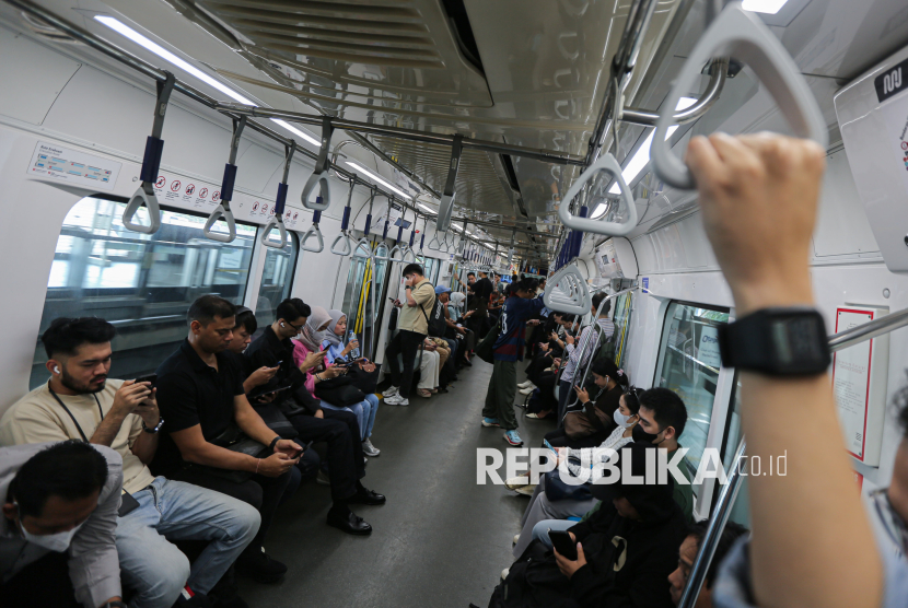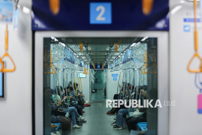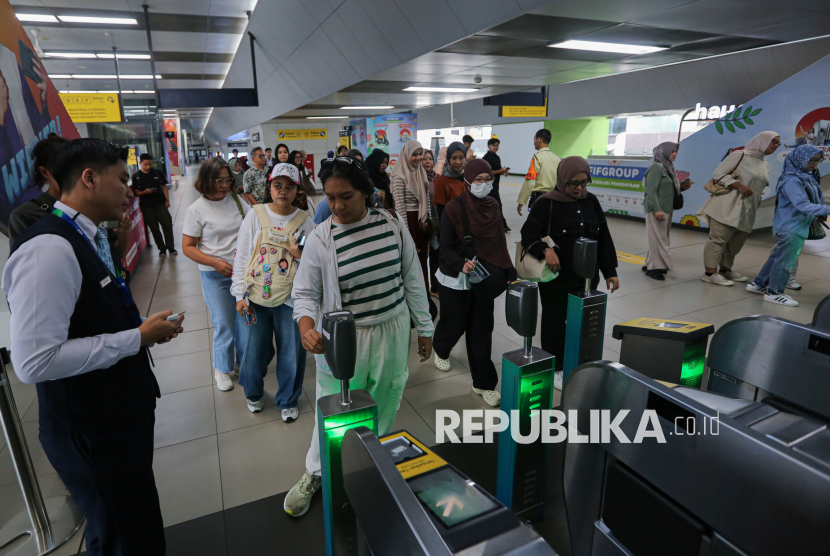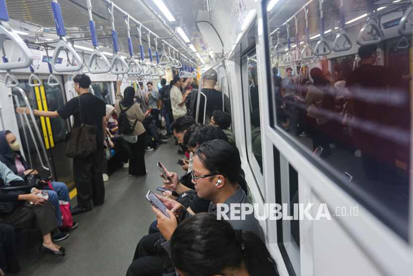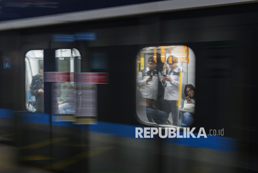 Penumpang menaiki transportasi umum Moda Raya Terpadu (MRT) di kawasan Blok M, Jakarta, Jumat (24/4/2026). Pemerintah Provinsi DKI Jakarta memberlakukan tarif khusus Rp1 bagi masyarakat yang menggunakan transportasi umum dalam rangka memperingati Hari Transportasi Nasional pada Jumat, 24 April 2026. Layanan ini berlaku untuk TransJakarta, MRT Jakarta, dan LRT Jakarta, mulai pukul 00.00-23.59 WIB. (FOTO : Republika/Thoudy Badai)