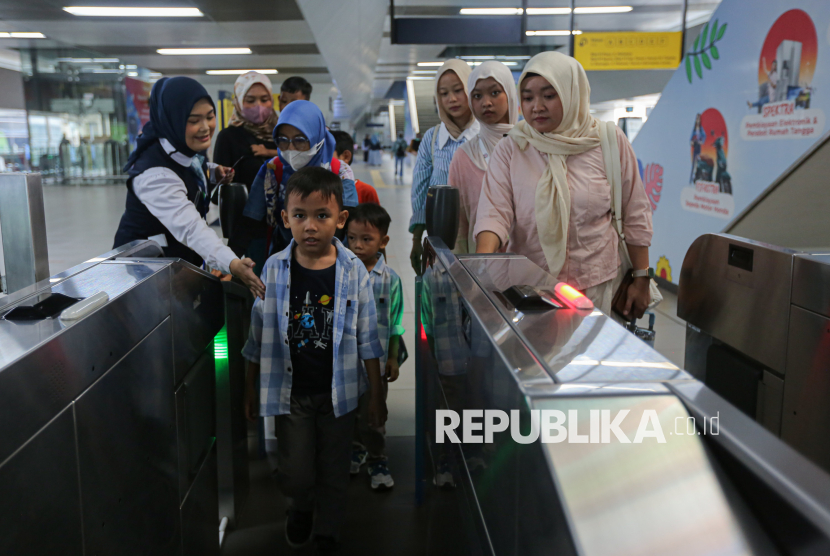 Penumpang menempelkan kartu uang elektronik usai menaiki transportasi umum Moda Raya Terpadu (MRT) di kawasan Blok M, Jakarta, Jumat (24/4/2026). Pemerintah Provinsi DKI Jakarta memberlakukan tarif khusus Rp1 bagi masyarakat yang menggunakan transportasi umum dalam rangka memperingati Hari Transportasi Nasional pada Jumat, 24 April 2026. Layanan ini berlaku untuk TransJakarta, MRT Jakarta, dan LRT Jakarta, mulai pukul 00.00-23.59 WIB. (FOTO : Republika/Thoudy Badai)