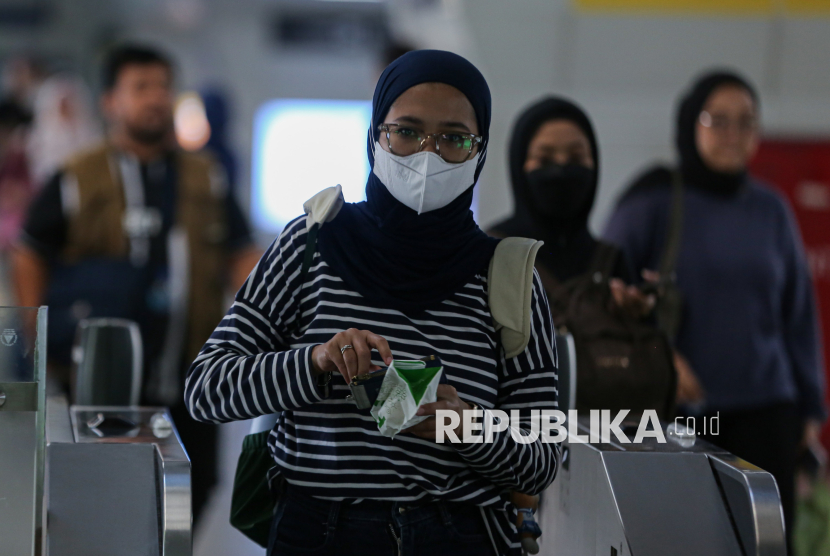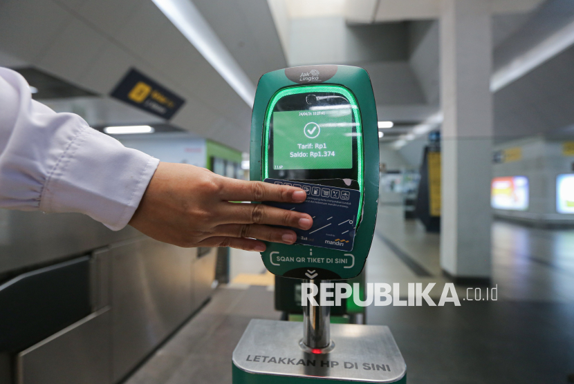 REPUBLIKA.CO.ID, JAKARTA -- Penumpang menempelkan kartu uang elektronik usai menaiki transportasi umum Moda Raya Terpadu (MRT) di kawasan Blok M, Jakarta, Jumat (24/4/2026).